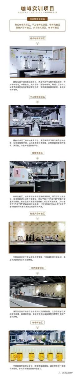 中国(重庆)职业技能公共实训中心现代服务业实训中心咖啡实训项目,位于A2区二楼东侧,建筑面积约1500㎡,主要实训设备40台套,实训工位80个,规划6大咖啡实训区,开设咖啡基础学、咖啡萃取与研磨、咖啡师技能、咖啡豆烘培、咖啡感官品鉴、咖啡师竞赛、汽泡水制作、果咖制作、花式咖啡制作、甜品制作、调酒制作、现代潮流饮料制作、产业链孵化双创等专业课程,可满足咖啡服务行业内90%以上的专业人才培训需求。